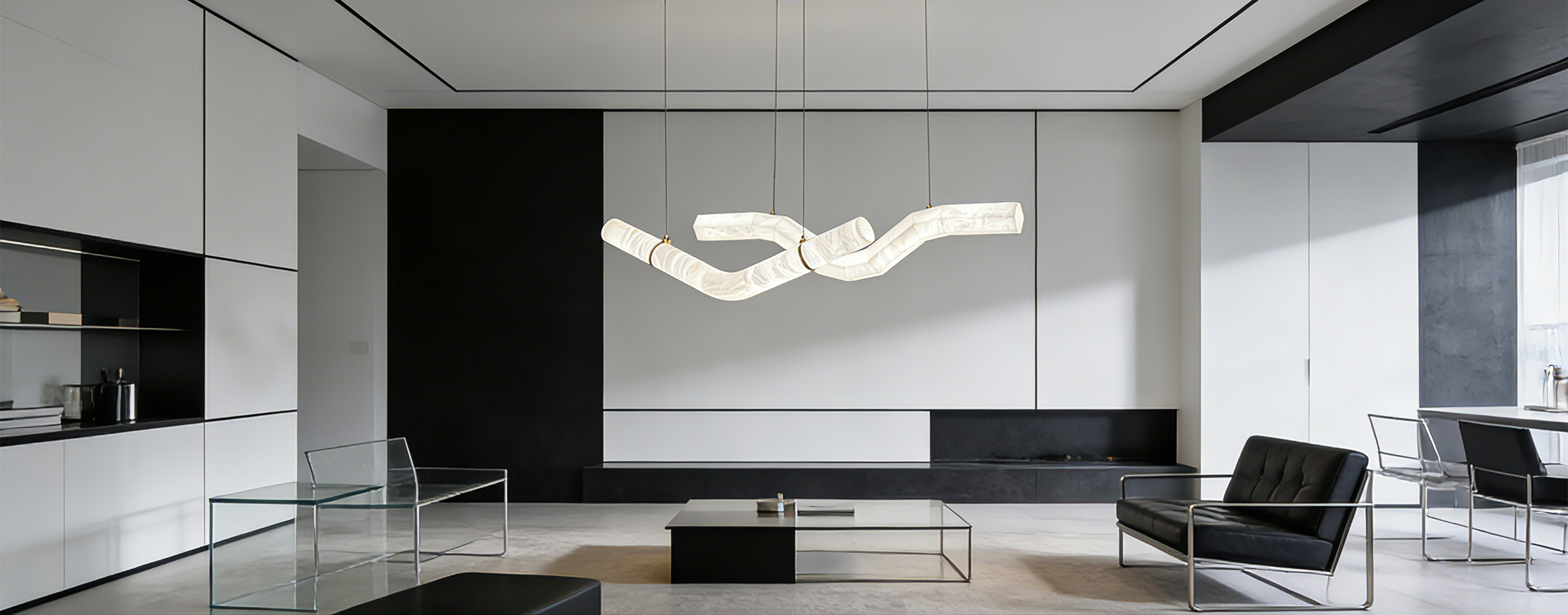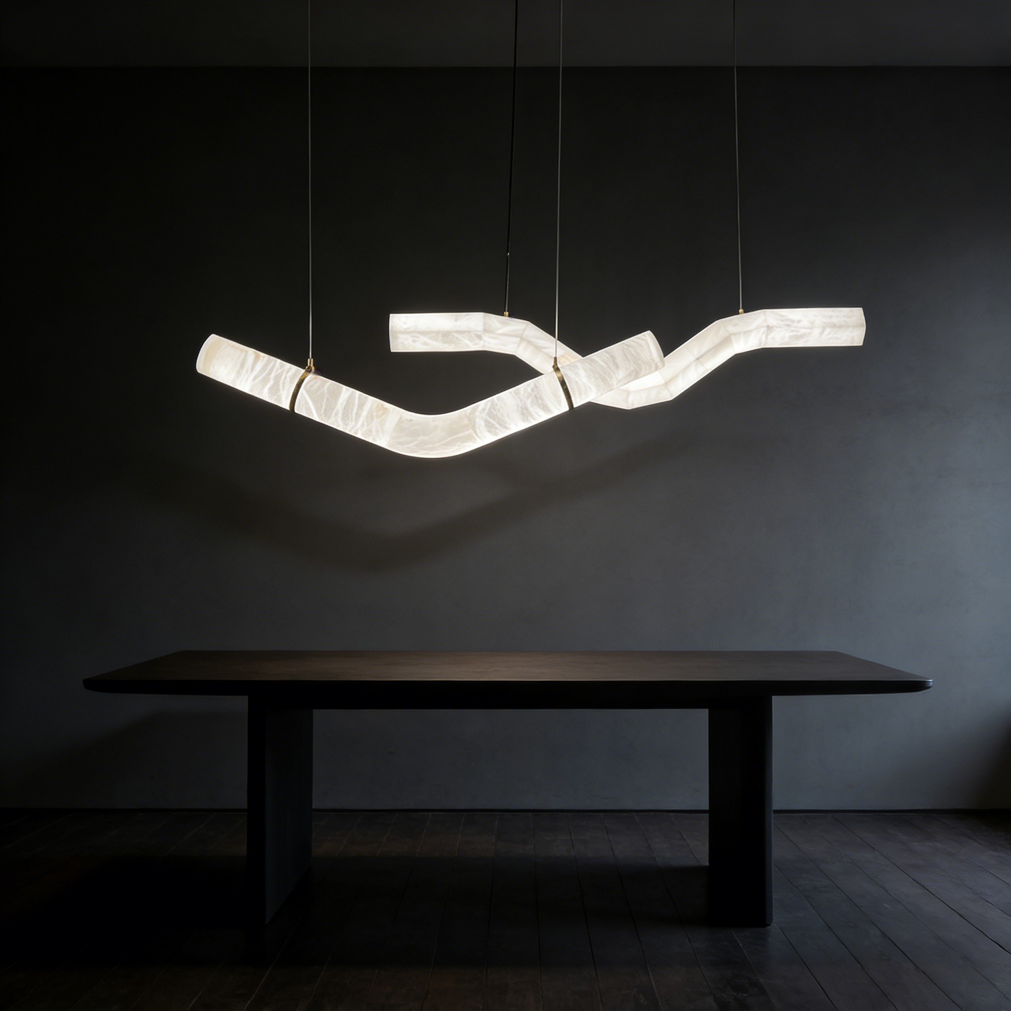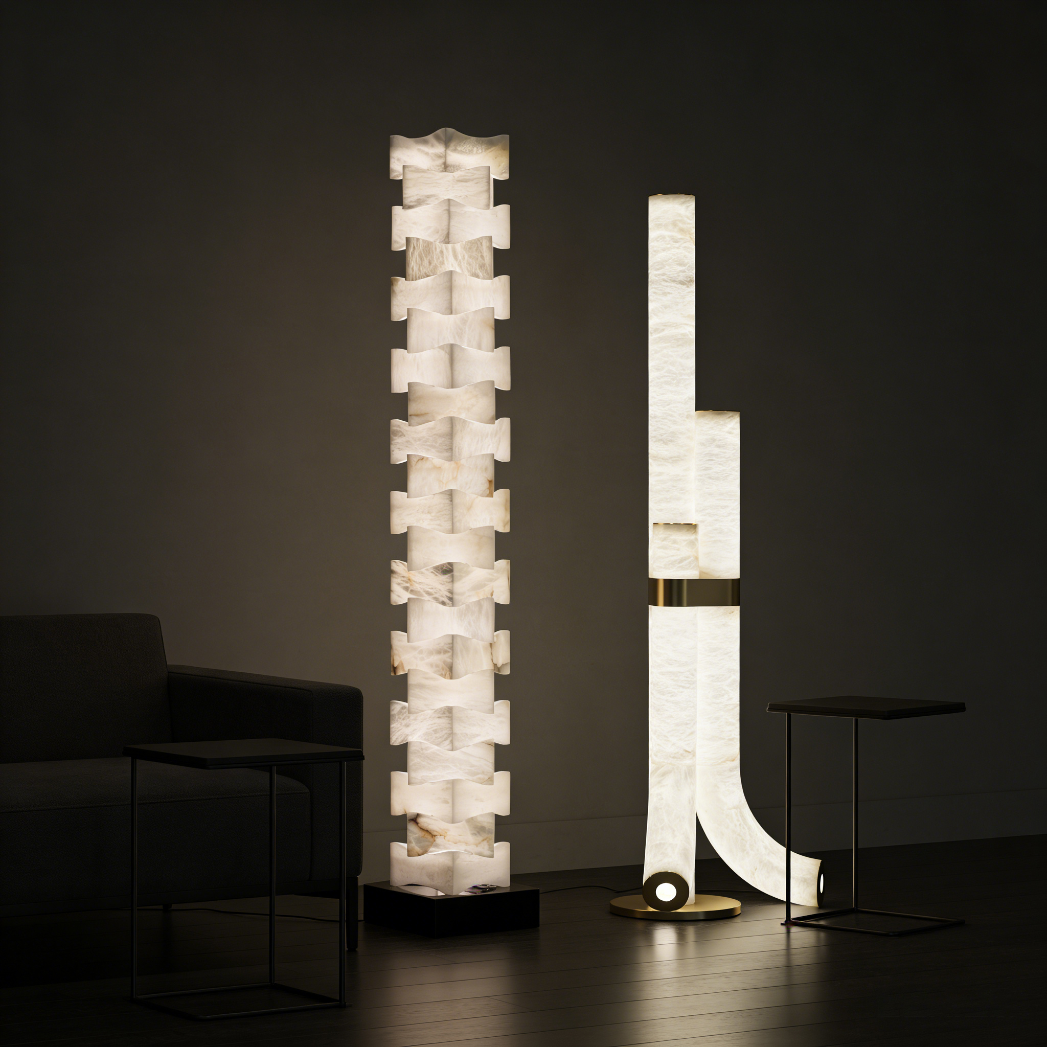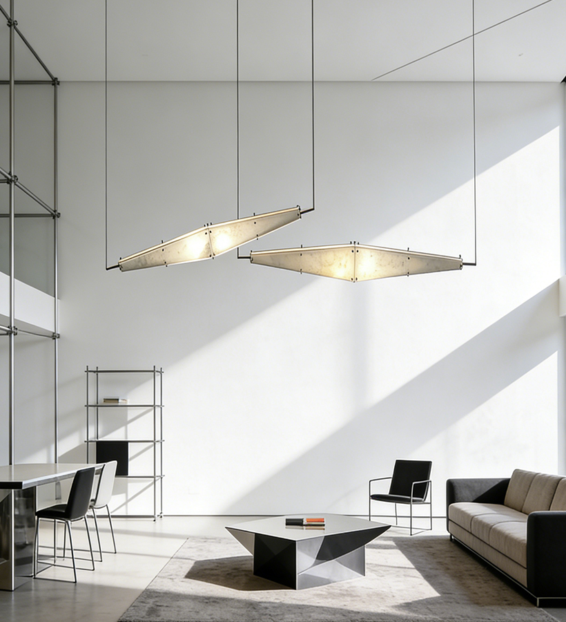 Minimalist geometric design meets natural alabaster. Two staggered leaves filter soft diffused light, ideal for penthouses and high-ceiling living rooms, redefining spatial artistry and light layers with modern aesthetics.