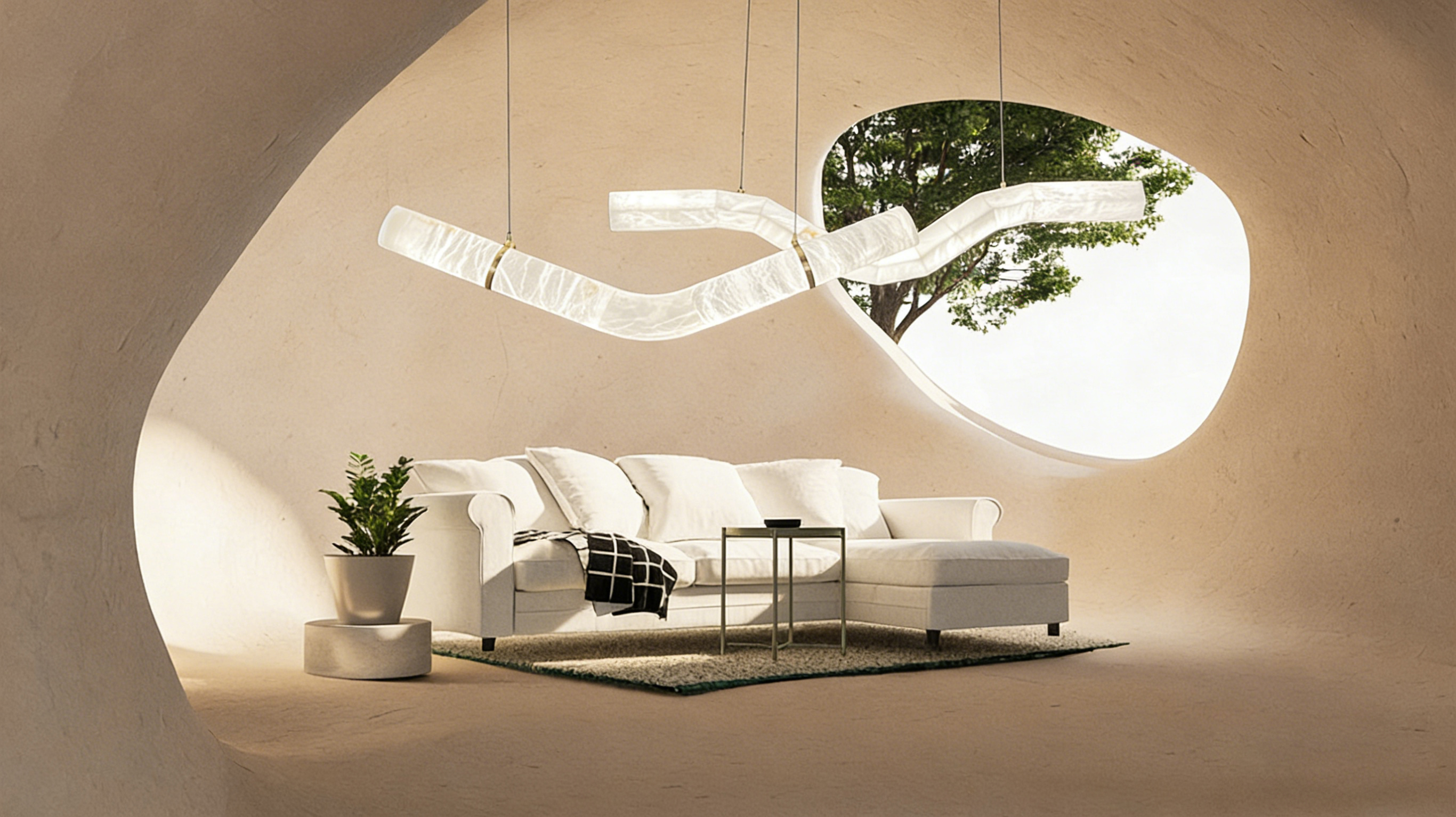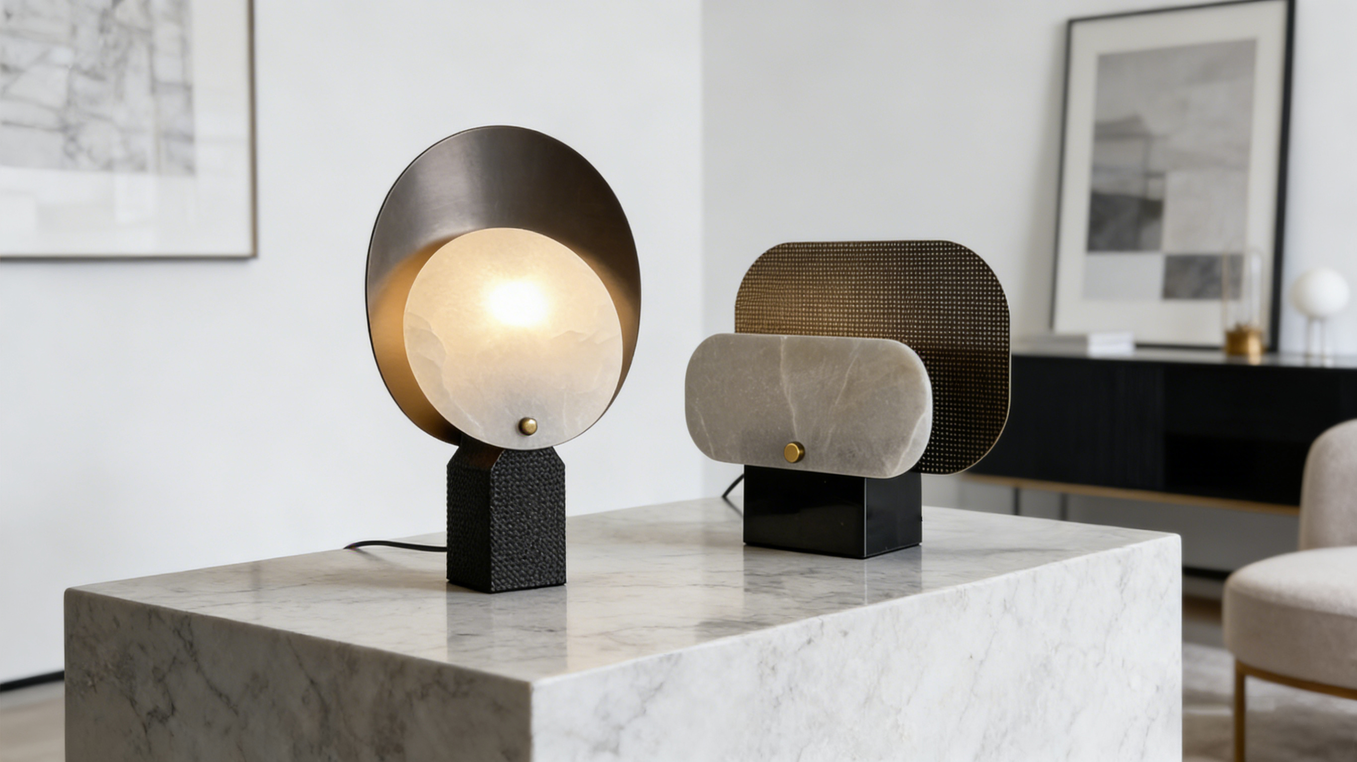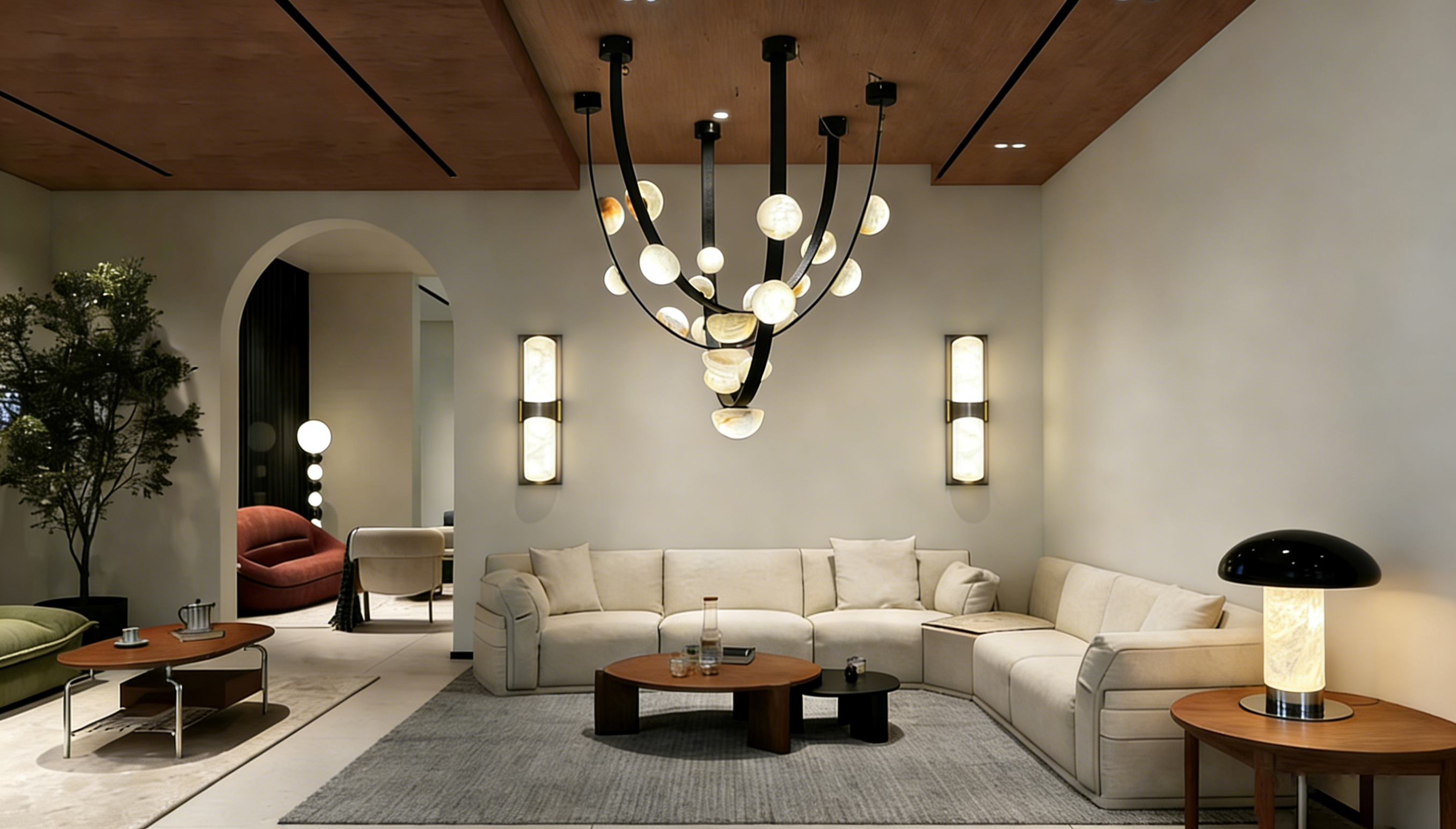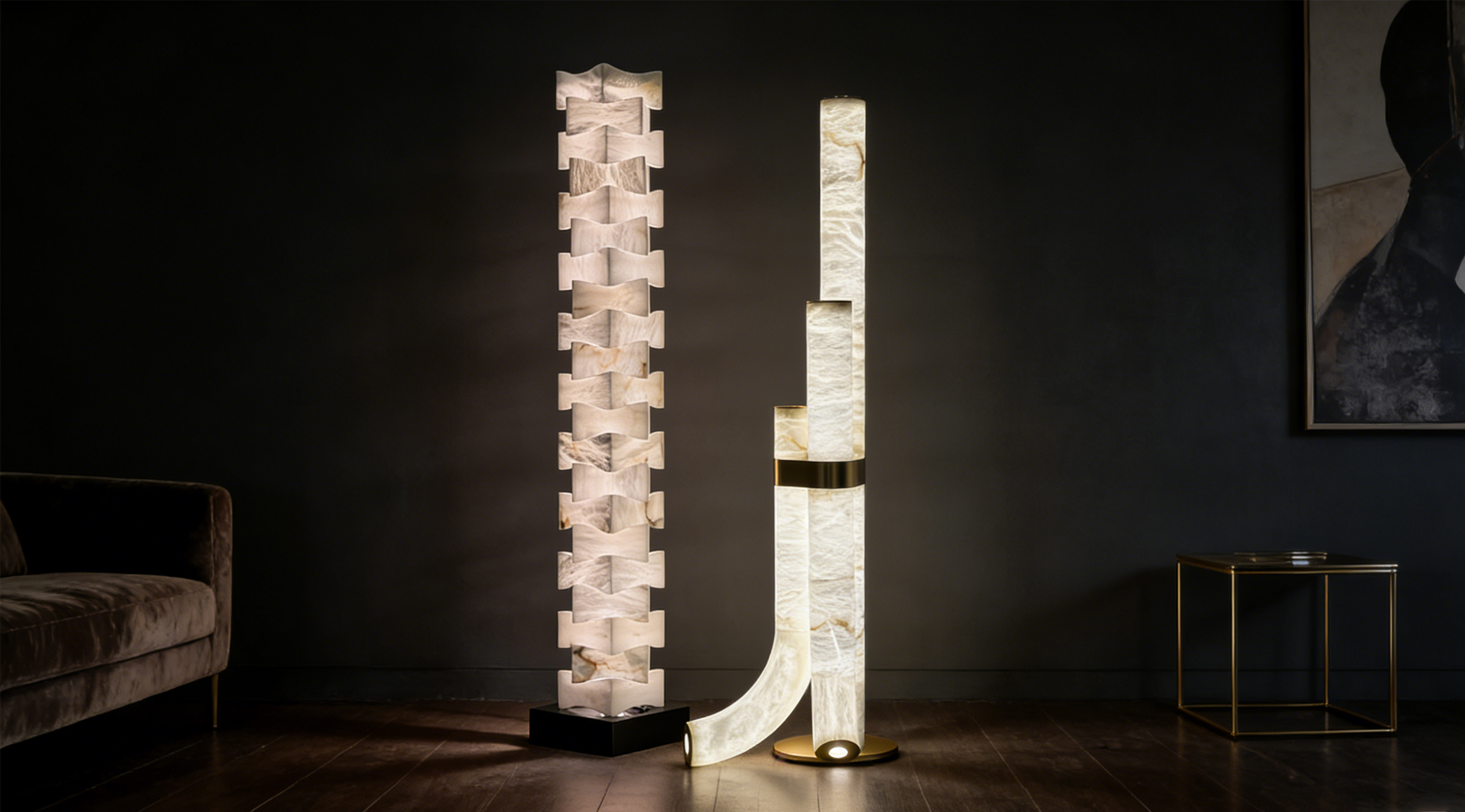 Minimalist geometric design meets natural alabaster. Two staggered leaves filter soft diffused light, ideal for penthouses and high-ceiling living rooms, redefining spatial artistry and light layers with modern aesthetics.