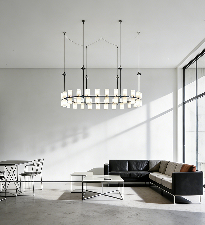 Circular metal frame with matrix alabaster blocks. Hand-polished stone emits uniform soft light, perfect for villas and open living rooms, crafting a luxurious ambiance with artisanal craftsmanship to elevate space elegance.