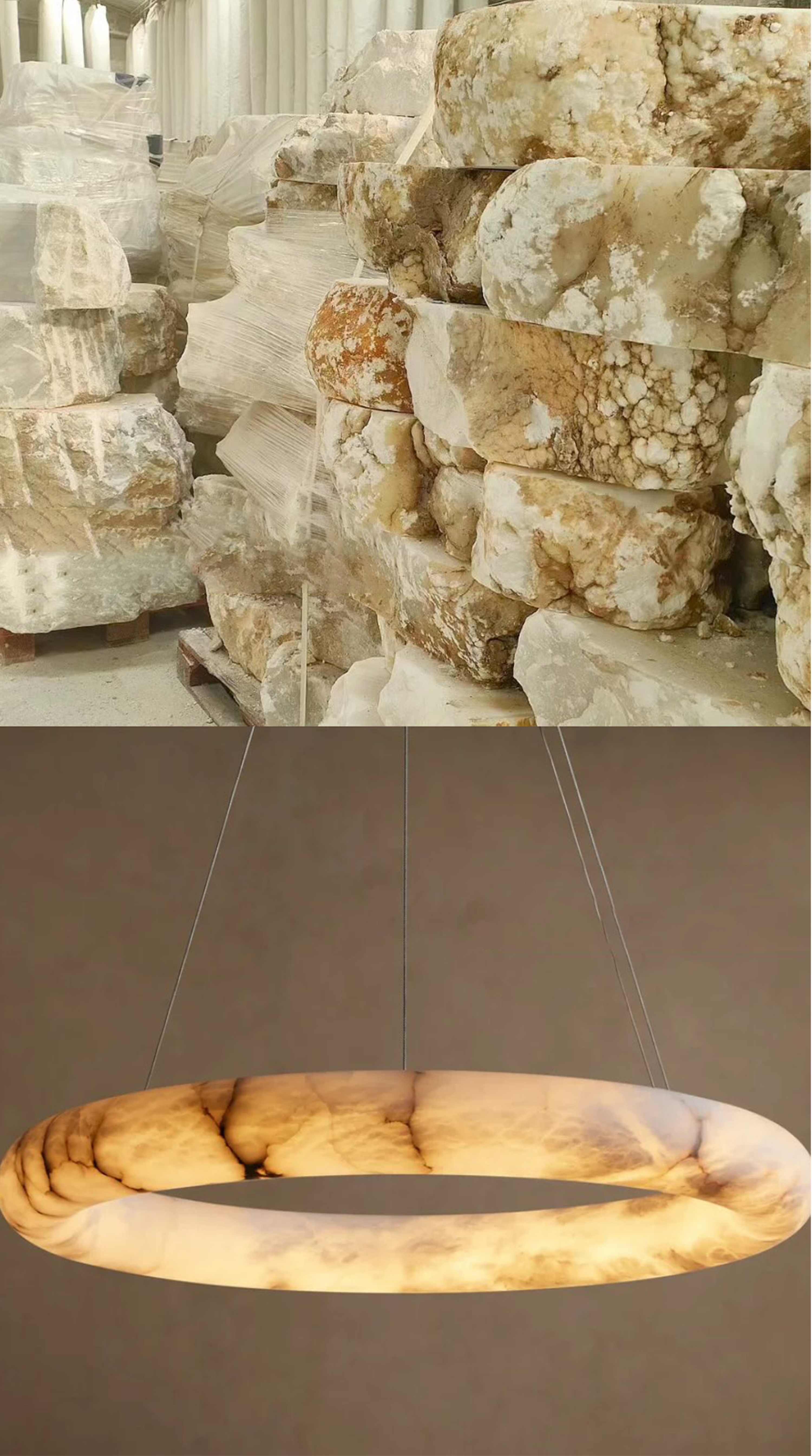 Alabaster chandeliers are produced by selecting premium, raw Spanish alabaster stone, which is then precision-cut, hand-carved, and turned on a lathe to create thin, translucent shades. These shades are polished to reveal unique veining and paired with metal fixtures, highlighting a "soft glow" effect, often with hand-finished metalwork.